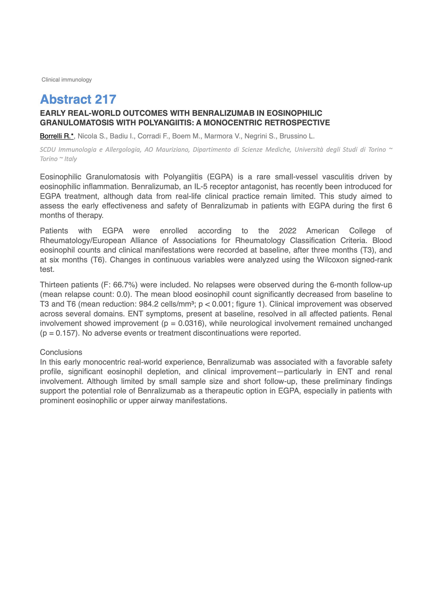EARLY REAL-WORLD OUTCOMES WITH BENRALIZUMAB IN EOSINOPHILIC GRANULOMATOSIS WITH POLYANGIITIS: A MONOCENTRIC RETROSPECTIVE