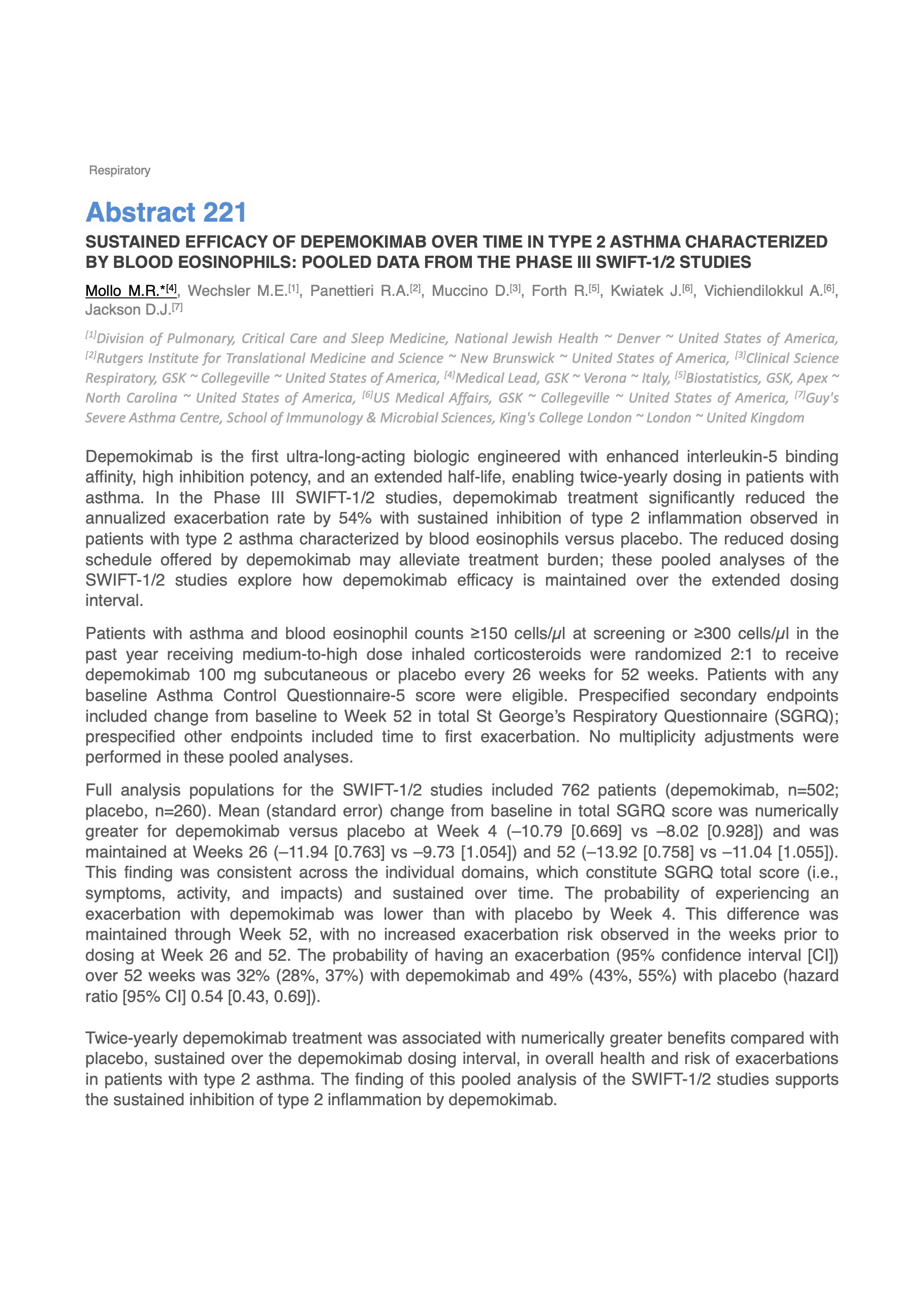 SUSTAINED EFFICACY OF DEPEMOKIMAB OVER TIME IN TYPE 2 ASTHMA CHARACTERIZED BY BLOOD EOSINOPHILS: POOLED DATA FROM THE PHASE III SWIFT-1/2 STUDIES