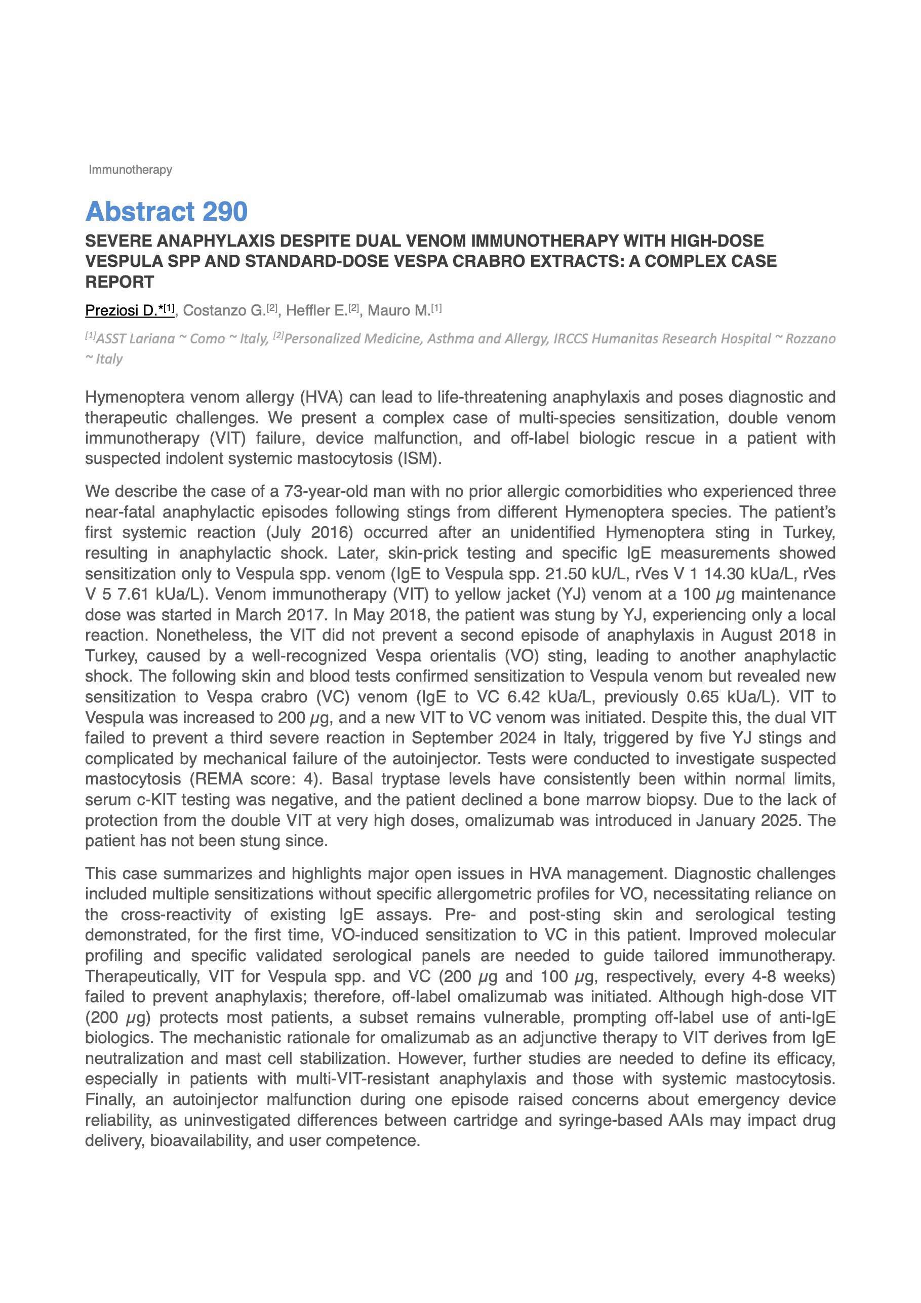 SEVERE ANAPHYLAXIS DESPITE DUAL VENOM IMMUNOTHERAPY WITH HIGH-DOSE VESPULA SPP AND STANDARD-DOSE VESPA CRABRO EXTRACTS: A COMPLEX CASE REPORT
