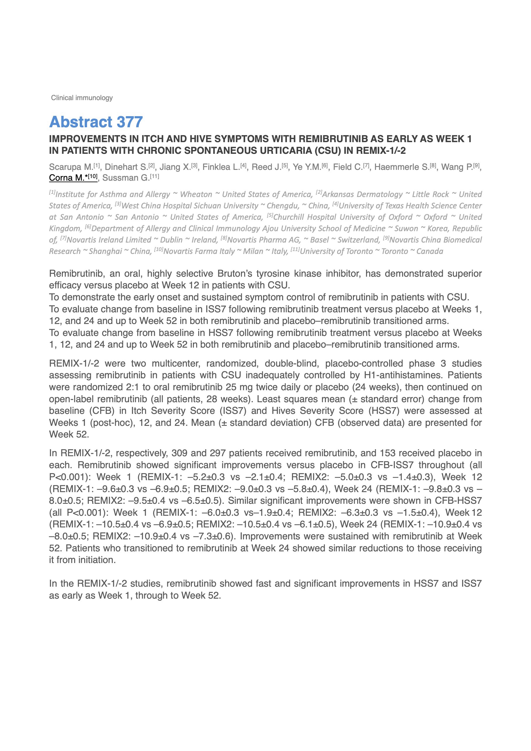 IMPROVEMENTS IN ITCH AND HIVE SYMPTOMS WITH REMIBRUTINIB AS EARLY AS WEEK 1 IN PATIENTS WITH CHRONIC SPONTANEOUS URTICARIA (CSU) IN REMIX-1/-2