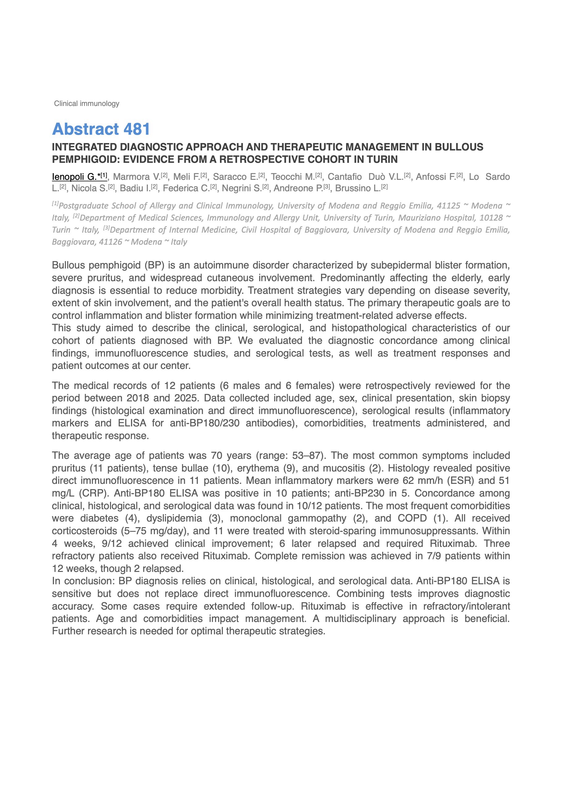 INTEGRATED DIAGNOSTIC APPROACH AND THERAPEUTIC MANAGEMENT IN BULLOUS PEMPHIGOID: EVIDENCE FROM A RETROSPECTIVE COHORT IN TURIN