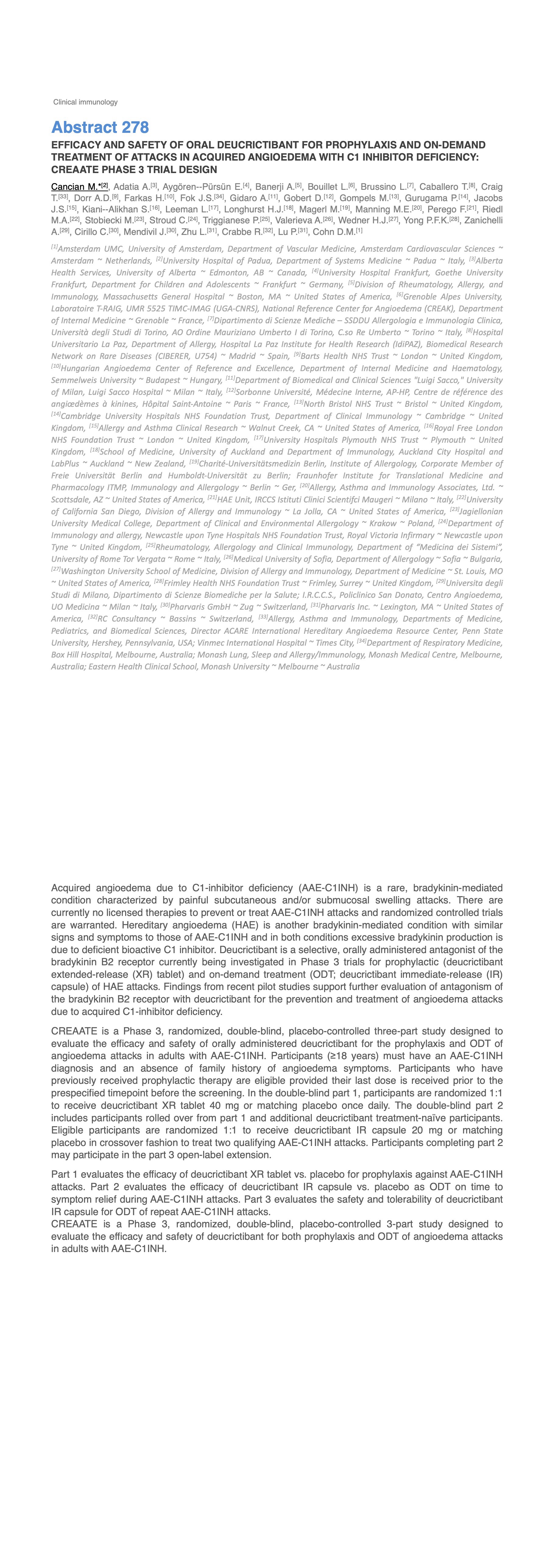 EFFICACY AND SAFETY OF ORAL DEUCRICTIBANT FOR PROPHYLAXIS AND ON-DEMAND TREATMENT OF ATTACKS IN ACQUIRED ANGIOEDEMA WITH C1 INHIBITOR DEFICIENCY: CREAATE PHASE 3 TRIAL DESIGN