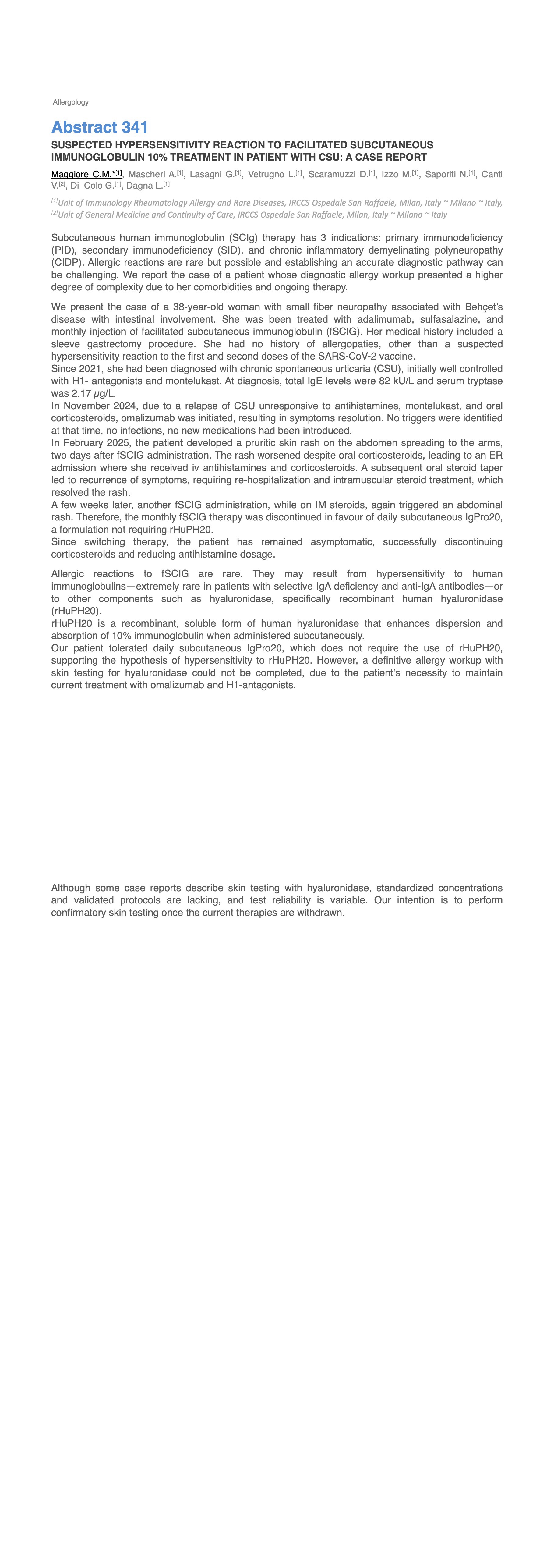 SUSPECTED HYPERSENSITIVITY REACTION TO FACILITATED SUBCUTANEOUS IMMUNOGLOBULIN 10% TREATMENT IN PATIENT WITH CSU: A CASE REPORT