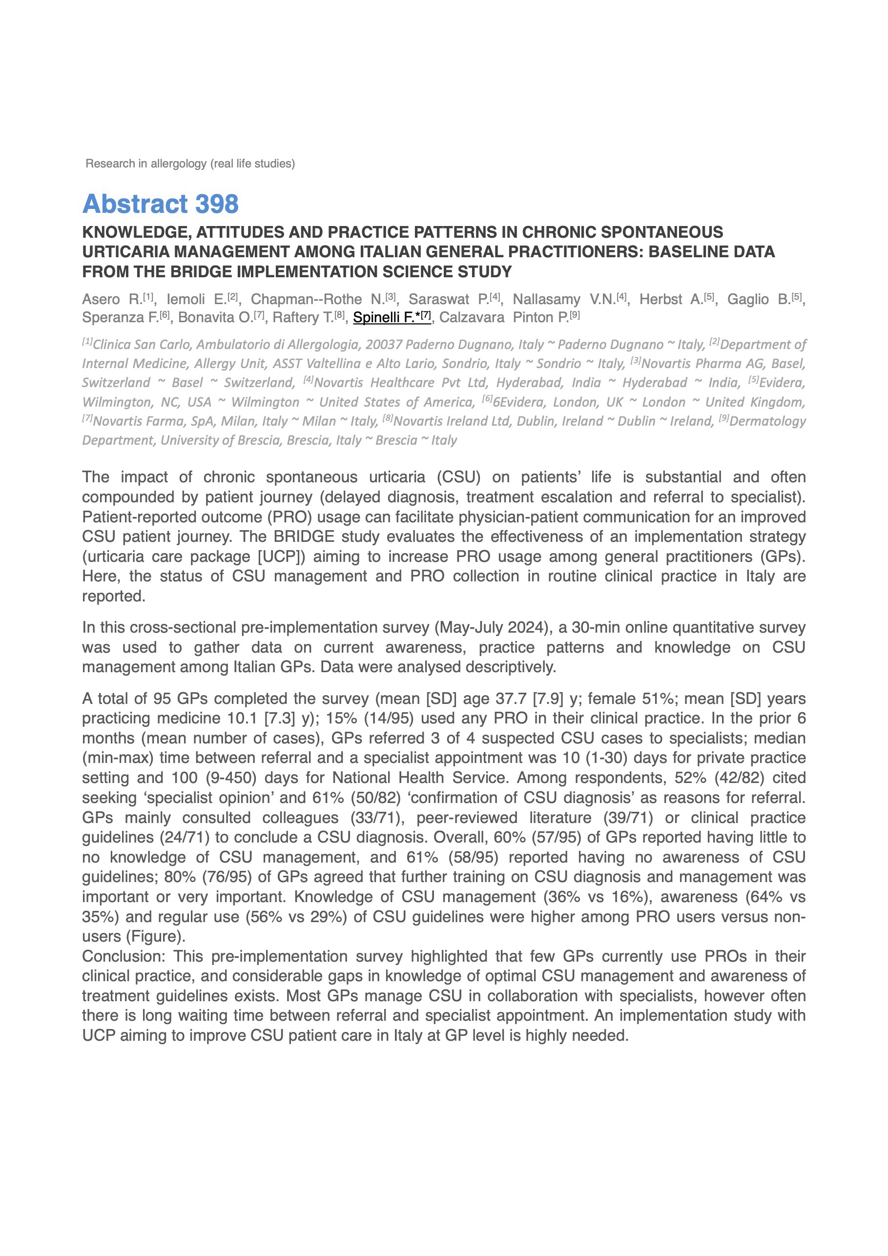 KNOWLEDGE, ATTITUDES AND PRACTICE PATTERNS IN CHRONIC SPONTANEOUS URTICARIA MANAGEMENT AMONG ITALIAN GENERAL PRACTITIONERS: BASELINE DATA FROM THE BRIDGE IMPLEMENTATION SCIENCE STUDY