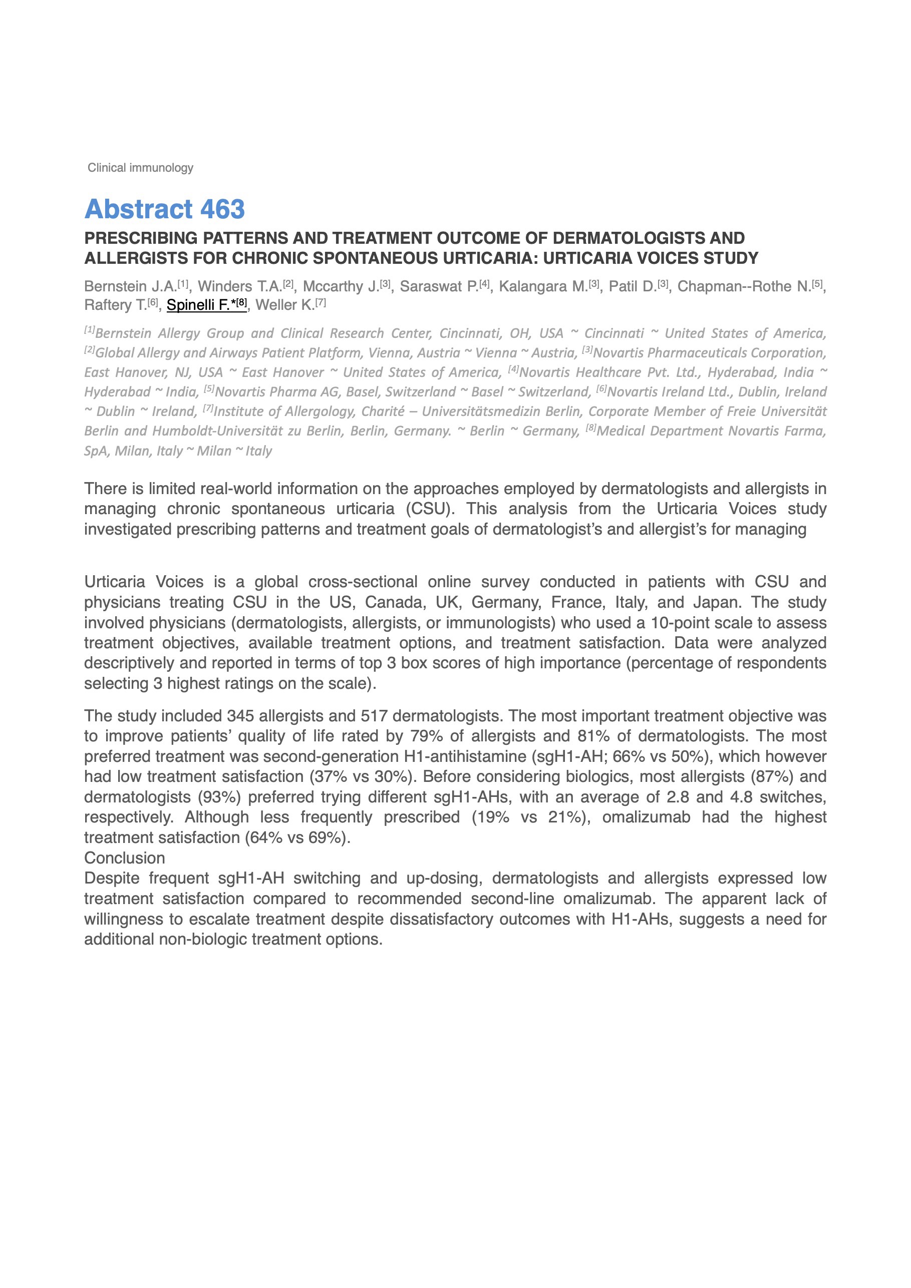 PRESCRIBING PATTERNS AND TREATMENT OUTCOME OF DERMATOLOGISTS AND ALLERGISTS FOR CHRONIC SPONTANEOUS URTICARIA: URTICARIA VOICES STUDY